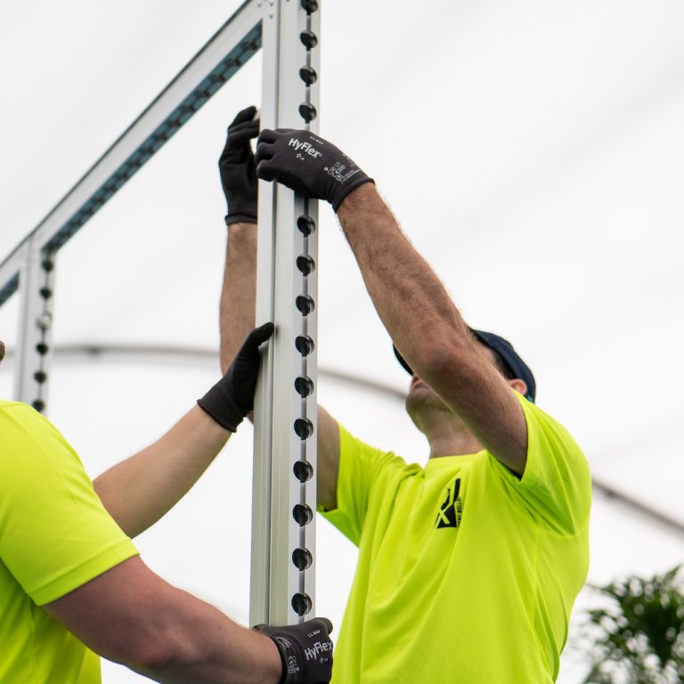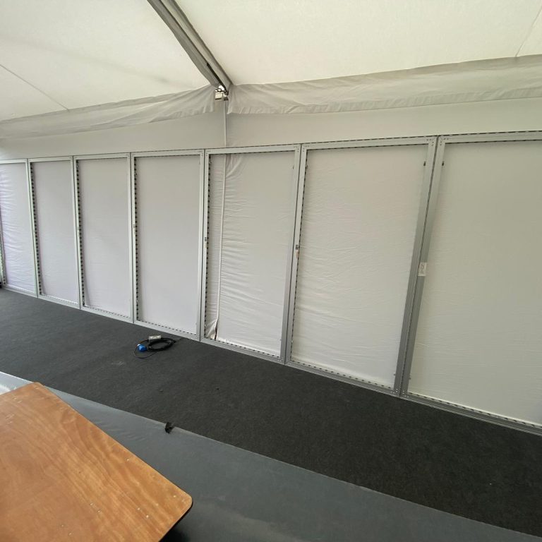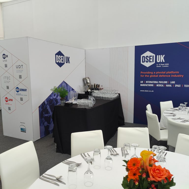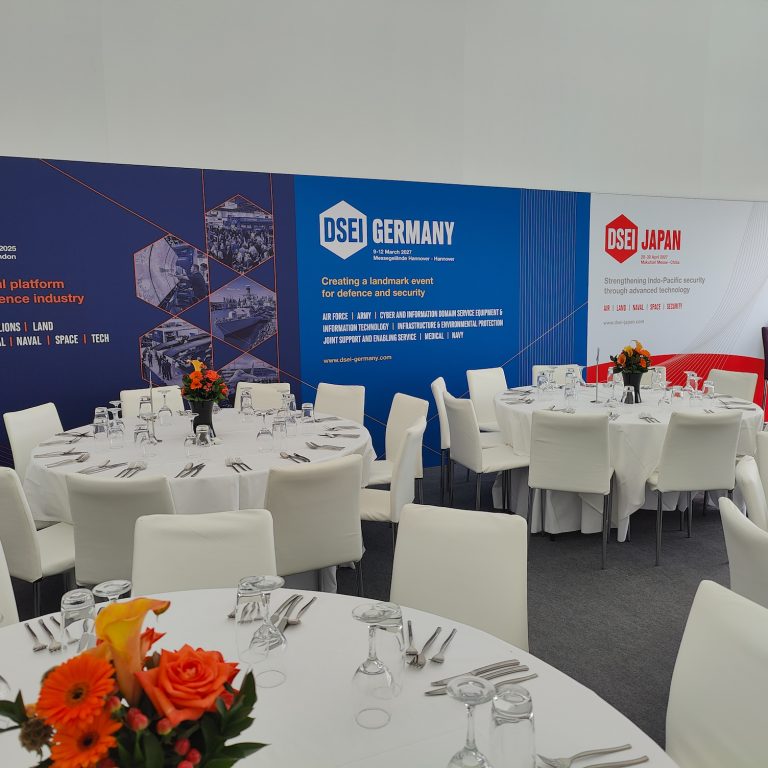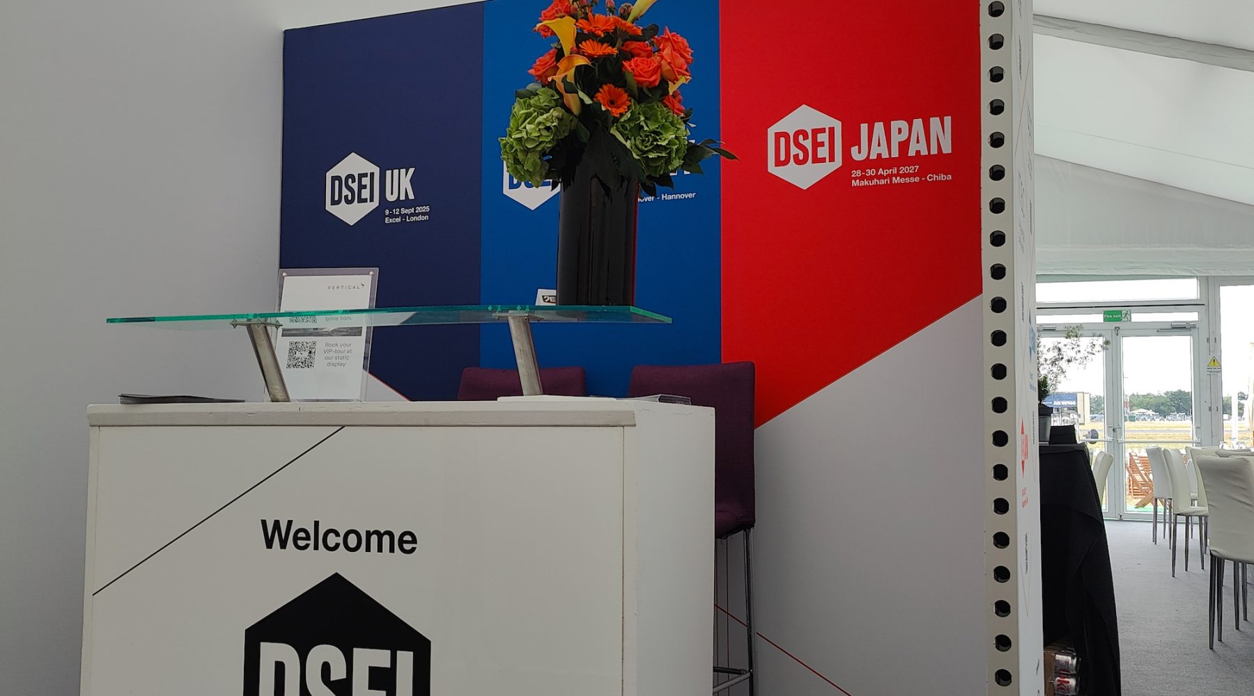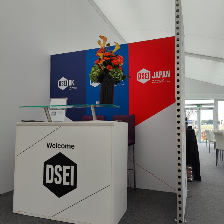 Chalet walling displaying information pertaining to upcoming global defence industry events for DSEI UK, DSEI Germany and DSEI Japan. Branded reception area with exposed industrial feel edging.